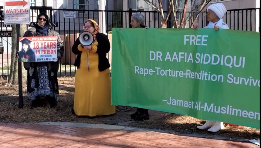 Muslim activists in Washington DC gathered outside the Pakistan Embassy on March 30, 2023, to demand the immediate release of Aafia Siddiqui on the 20th anniversary of her abduction.